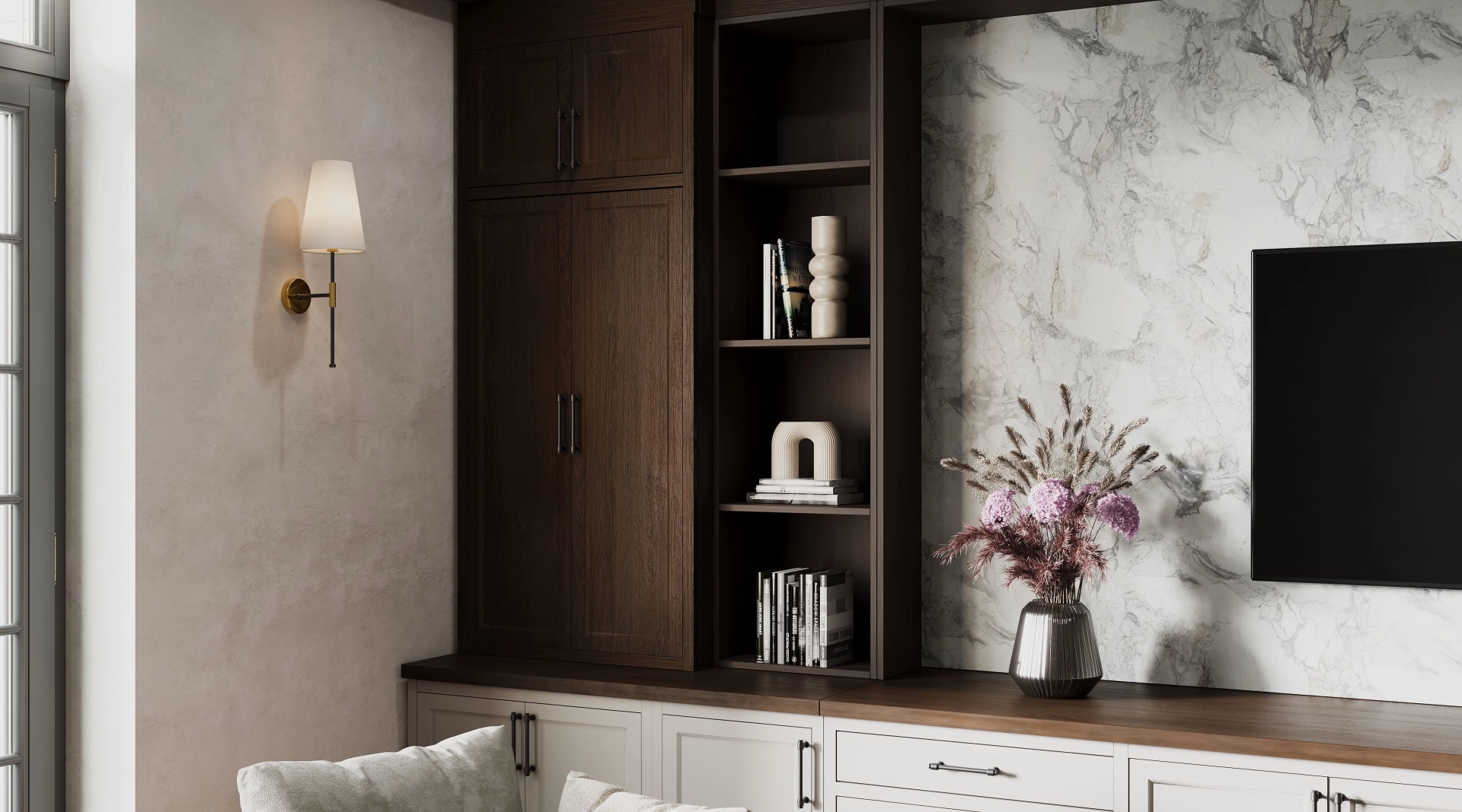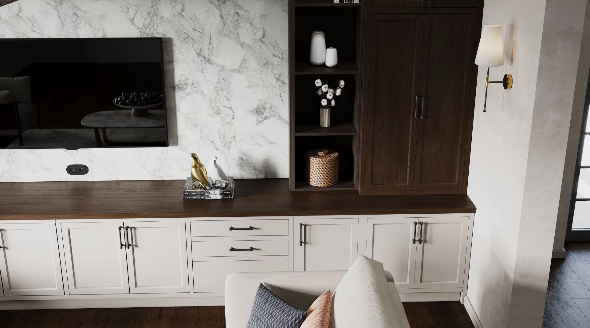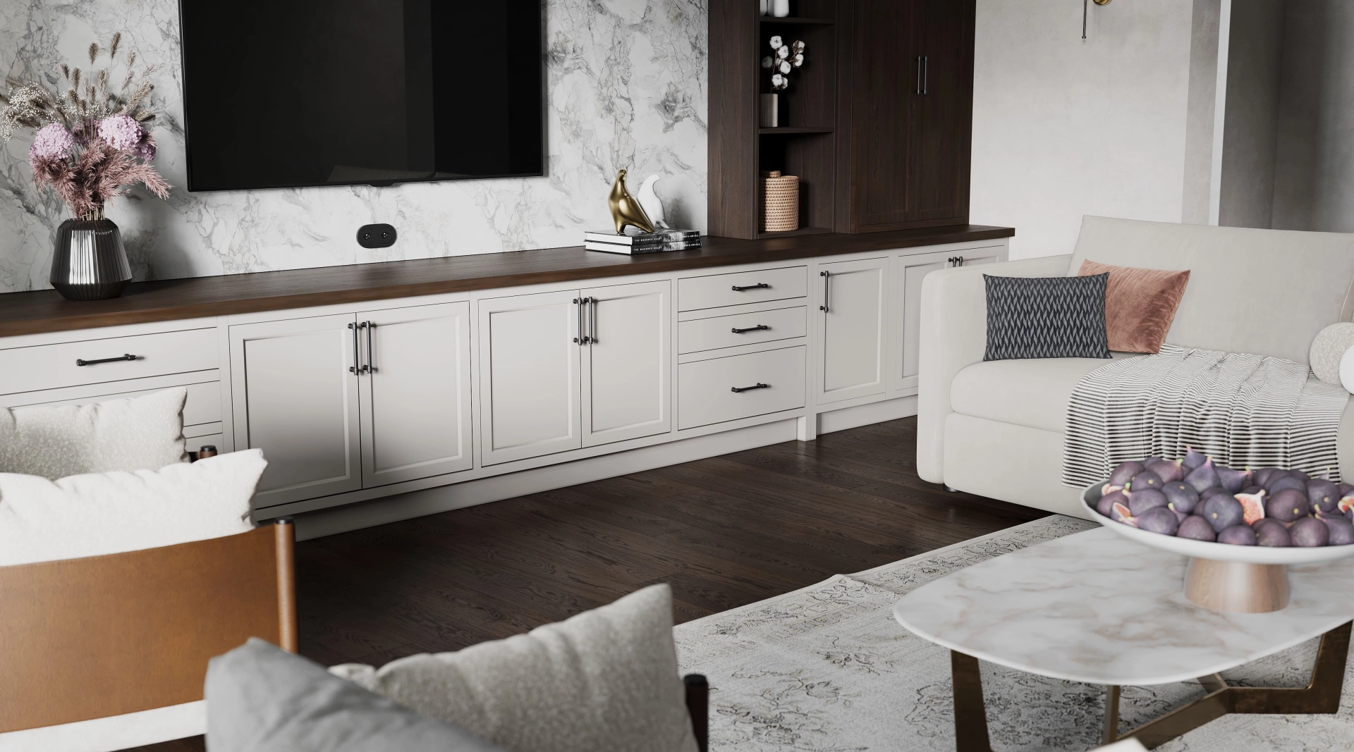 Гостиная Portmerion - пространство, которое дышит спокойствием. Здесь нет показной роскоши - только продуманный комфорт, качественные материалы и та особая, неторопливая атмосфера, ради которой и создаются настоящие загородные дома. Сочетание светлых поверхностей с акцентами под тёмное дерево образует классический английский контраст - сдержанный, благородный и невероятно уютный.